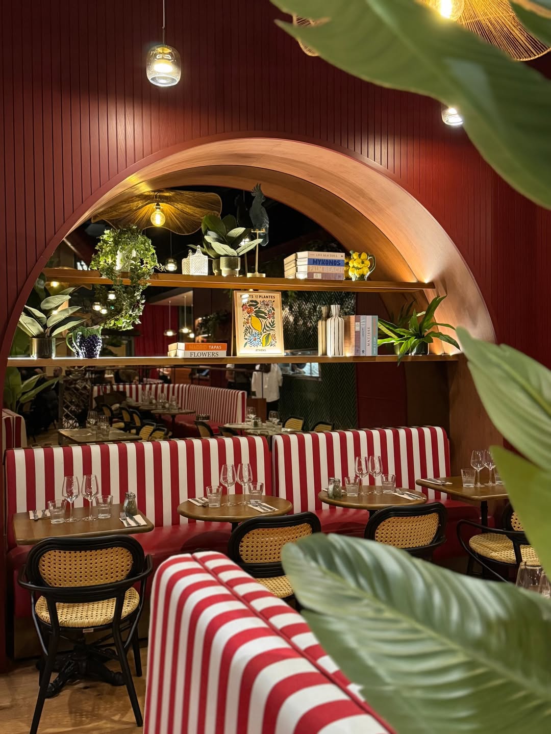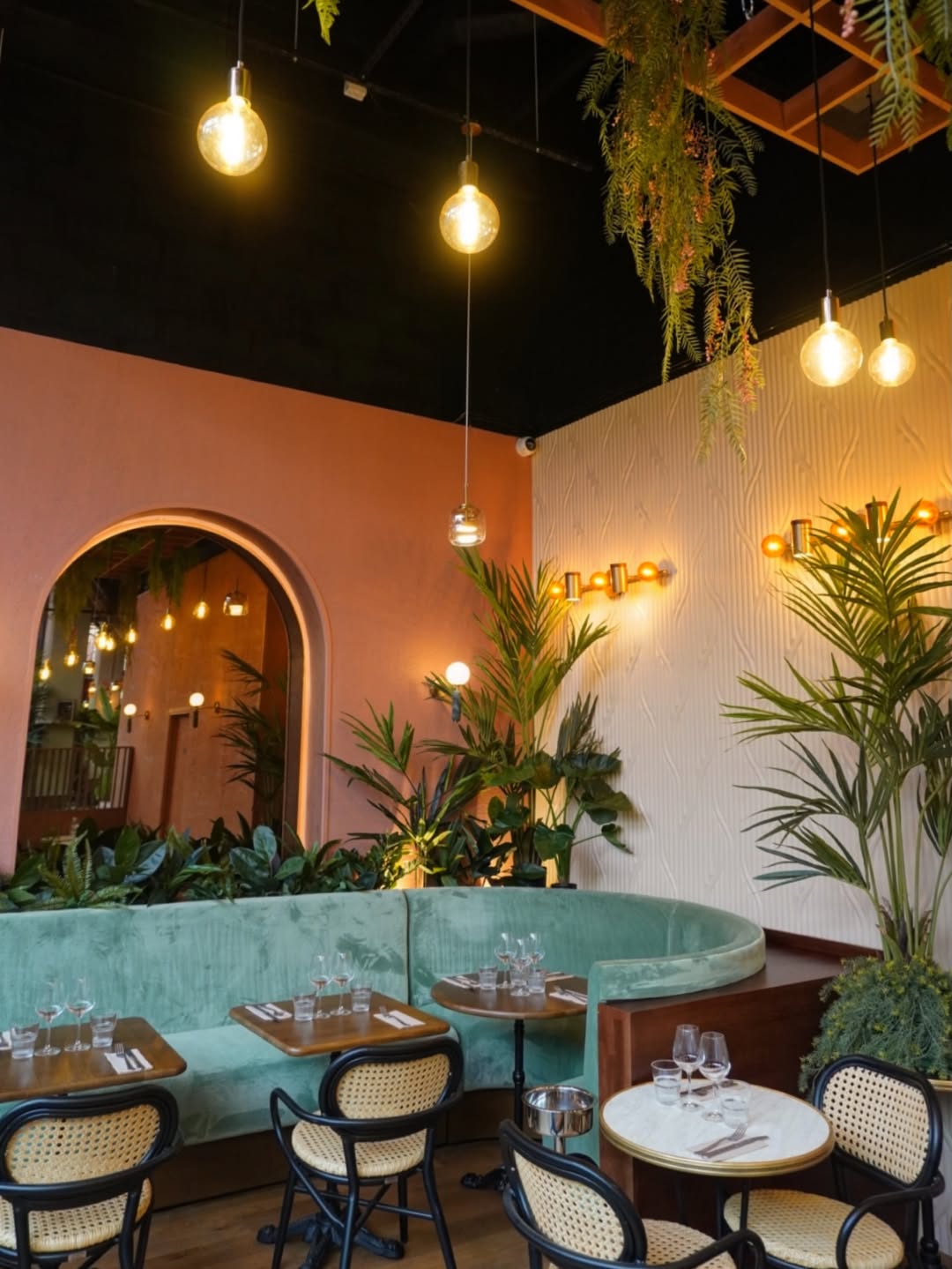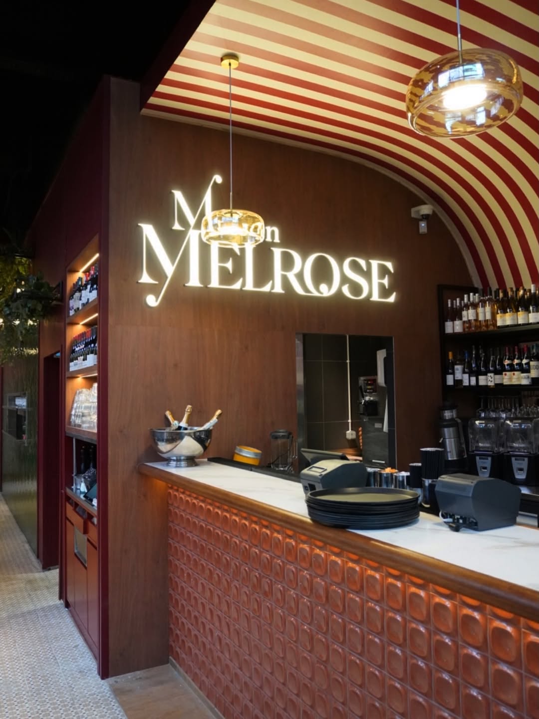 Maison Melrose est une brasserie mediterraneenne nichee au coeur du nouveau quartier Issy Coeur de Ville. Murs terracotta, banquettes en velours vert sauge, plantes tropicales luxuriantes et lumieres Edison composent un decor unique.